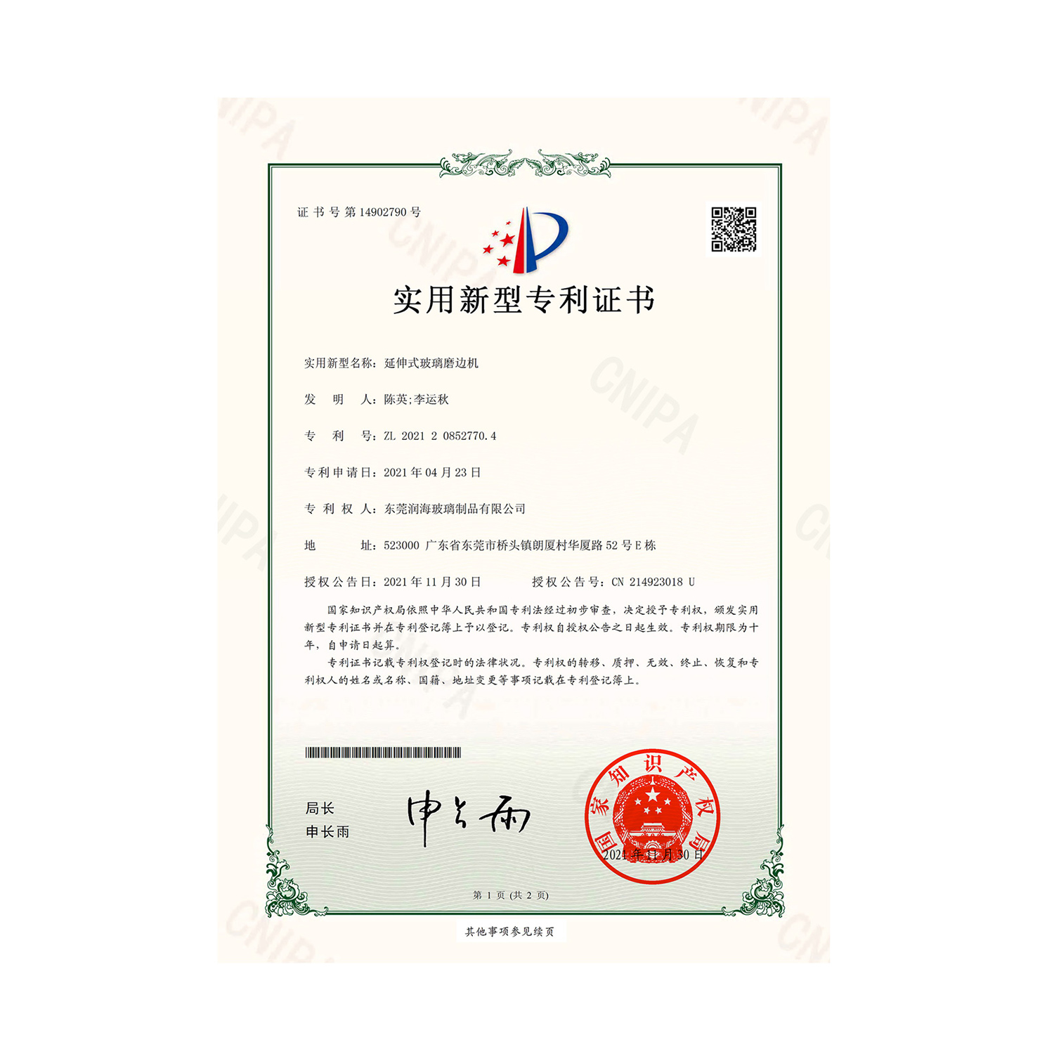 • 專利證書